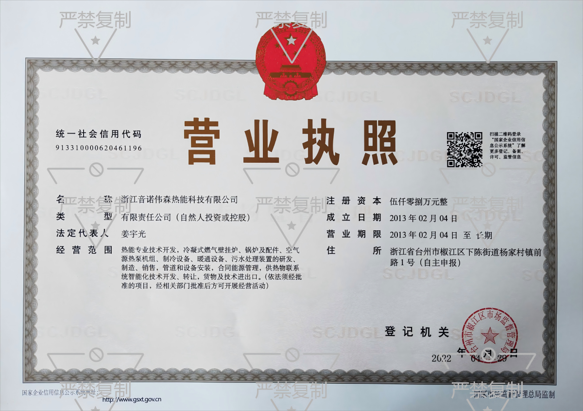 浙江音諾偉森熱能科技有限公司創立于2013年2月4日,位于浙江省臺州市下陳街道鎮前路1號,專業生產家用燃氣壁掛爐,冷凝采暖熱水爐,冷凝熱水機組,蒸汽發生器。產品功率范圍覆蓋18KW-4200KW,可為系統要求,量身定做。音諾偉森產品低氮、高效,符合國家最新環保要求,同時降低使用成本,特別適合現有酒店的鍋爐改造。